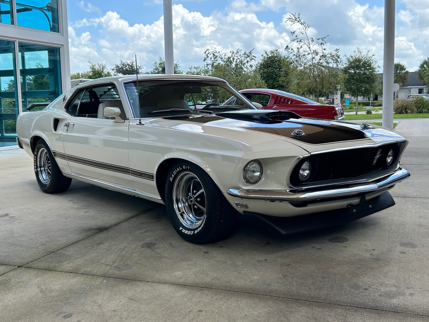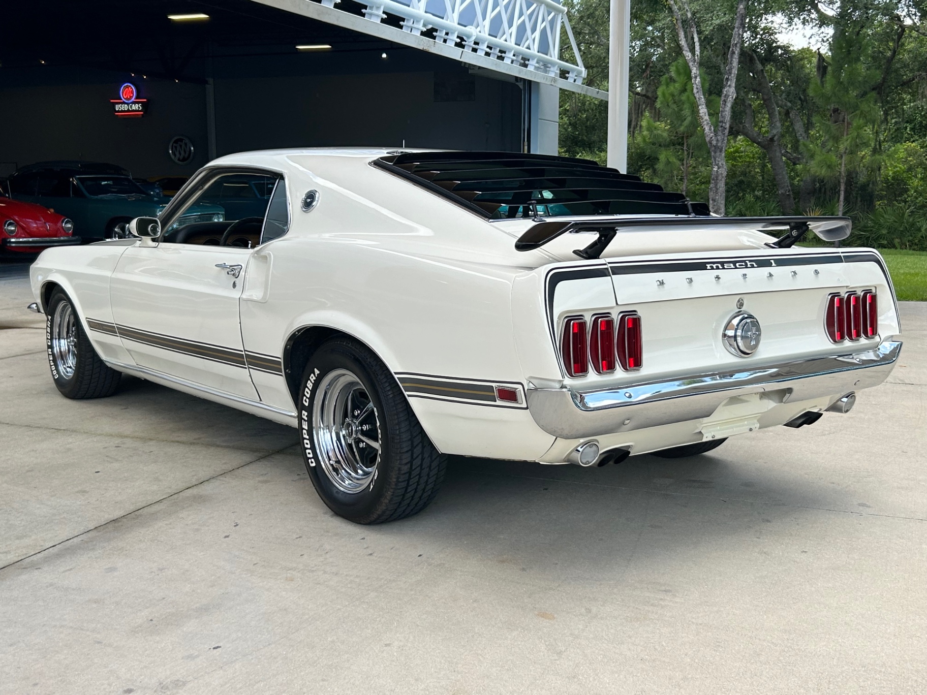 The 1969 Ford Mustang Mach 1 is a standout classic, particularly in its restored form. Featuring the iconic 'Sports Roof' body style, this model is powered by a 351 cubic inch engine, as confirmed by its VIN H-code. It includes an automatic transmission, blacked-out hood with scoop, side graphics, and both front and rear spoilers. The exterior is finished in a striking white with a MACH 1 stripe package and is complemented by factory chrome styled wheels and fat raised white letter Cooper Cobra Radial GT tires.