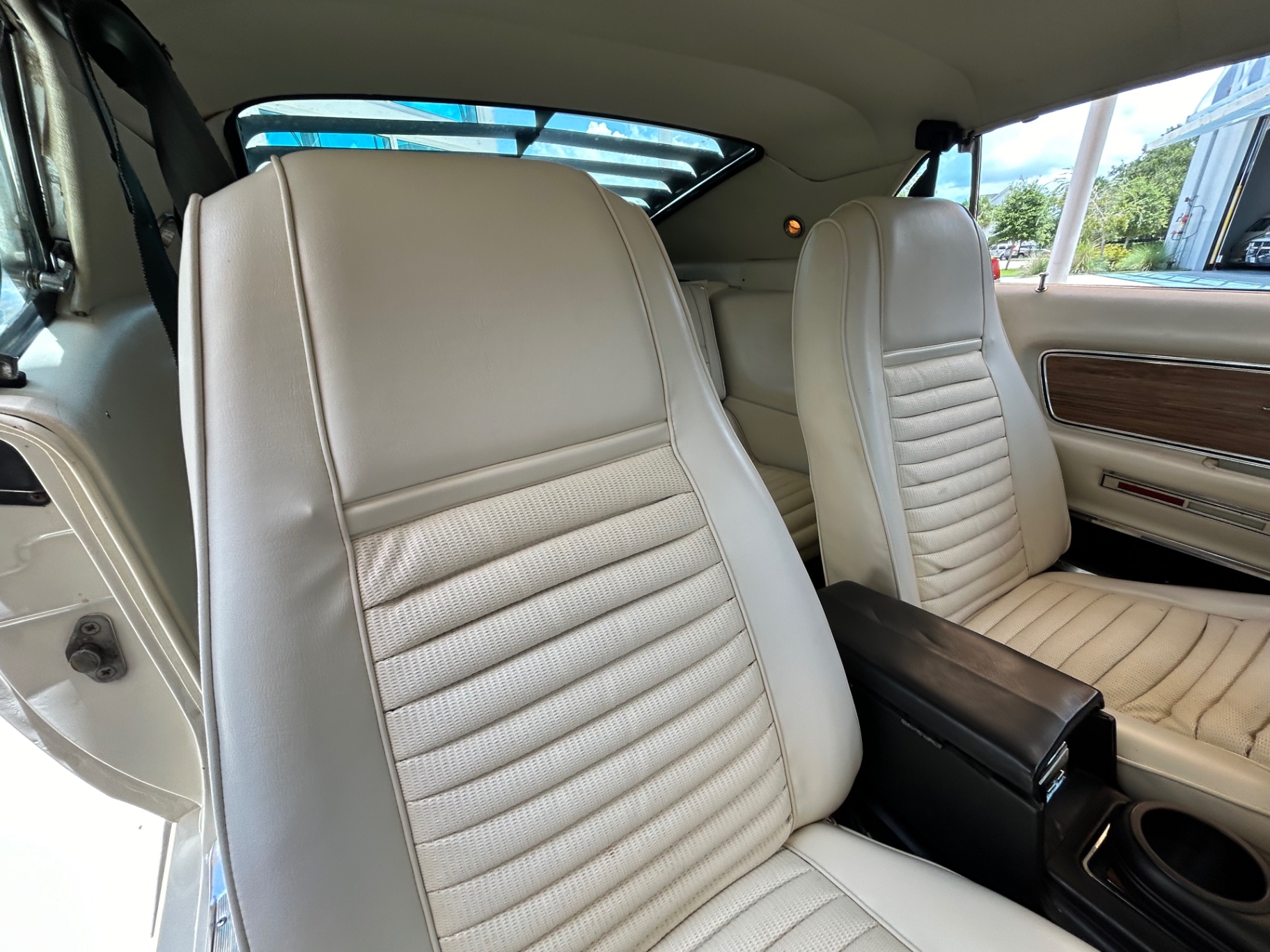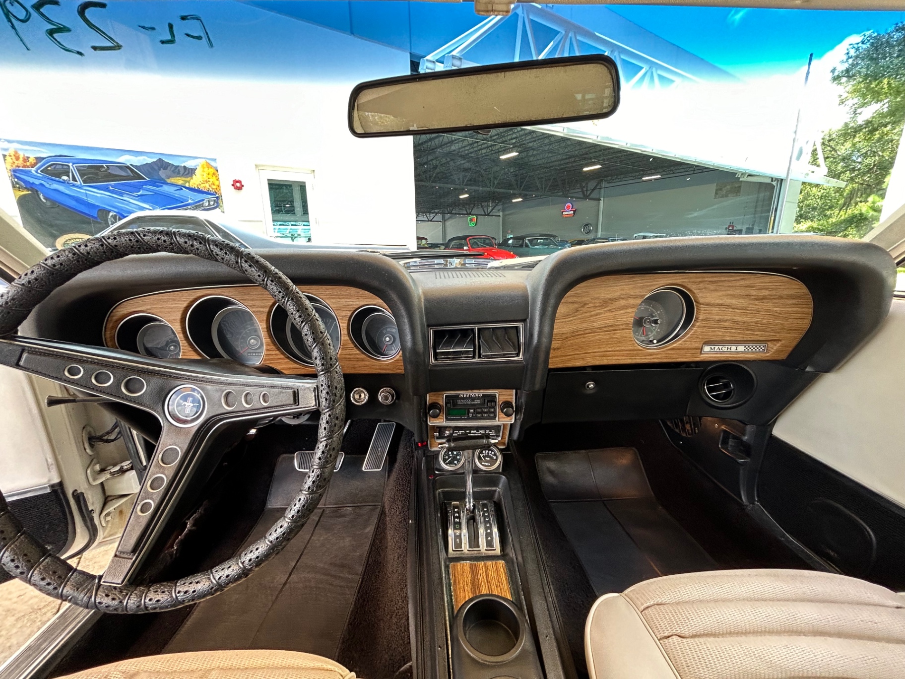 The interior of this Mach 1 is equally impressive, showcasing white bucket seats with knit vinyl, white molded door panels with wood grain trim, and a wood grain dash. Additional interior features include an upgraded Mustang logo stereo, factory gauges, accessory gauges, a center console with armrest, and a black sport steering wheel. With its clean and detailed engine compartment, complete with chrome engine rigidity bars and a chrome air cleaner, this Mach 1 combines performance with classic styling.