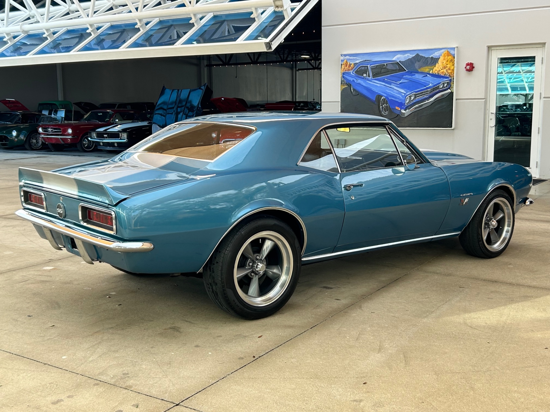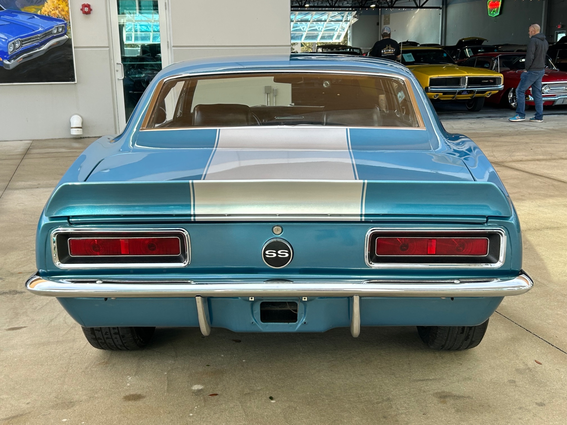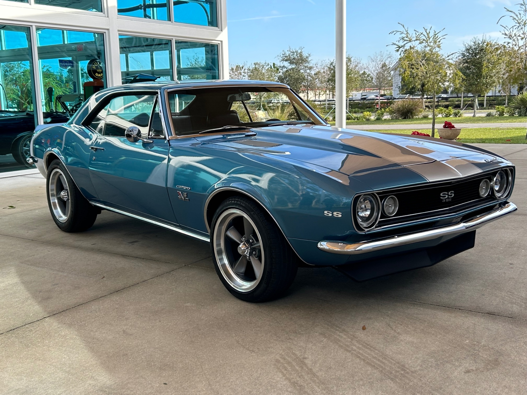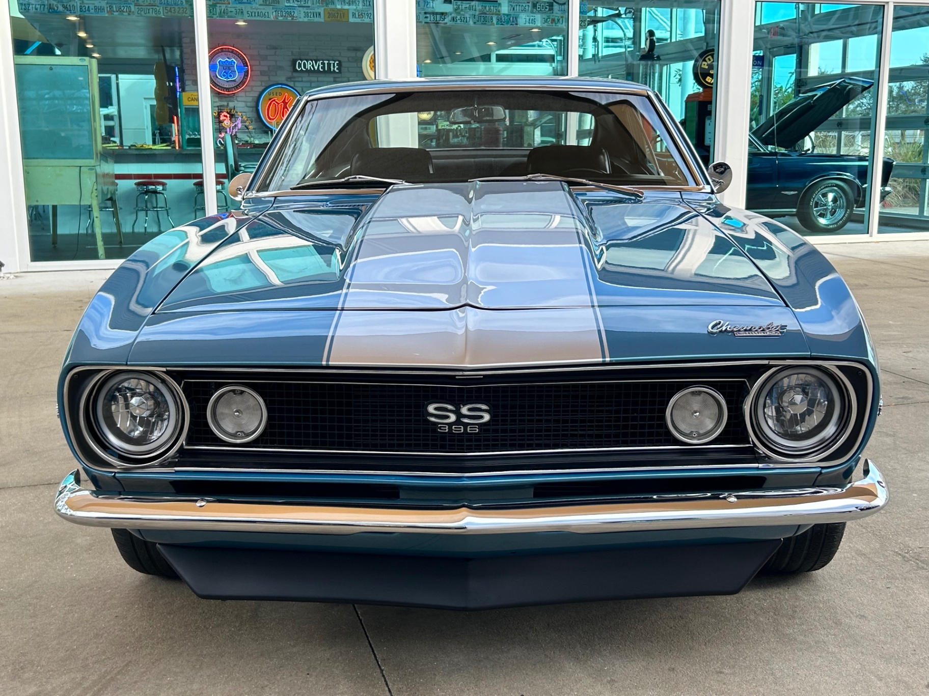 This classic Camaro SS 396 is a standout with its powerful big block engine and modern upgrades. It features a 396 cubic inch big block engine with Chevrolet Racing orange paint, an aluminum intake, and a performance four-barrel carburetor. Headers and Flowmaster mufflers enhance its sound, while the 4-speed 700R4 Automatic Overdrive transmission ensures smooth driving. The car is equipped with power rack and pinion steering, power disc brakes, front and rear sway bars, and an aluminum radiator. The restored black interior includes factory bucket seats, a 4-speed automatic chrome shifter, and custom gauges, with a three-spoke sports steering wheel and a pushbutton radio. Externally, it boasts PPG Base coat clear coat blue paint, a cowl induction hood with a grey stripe, SS badging, and grey and polished mag wheels with black sidewall tires. This Camaro’s striking looks and performance features make it a compelling choice for enthusiasts.