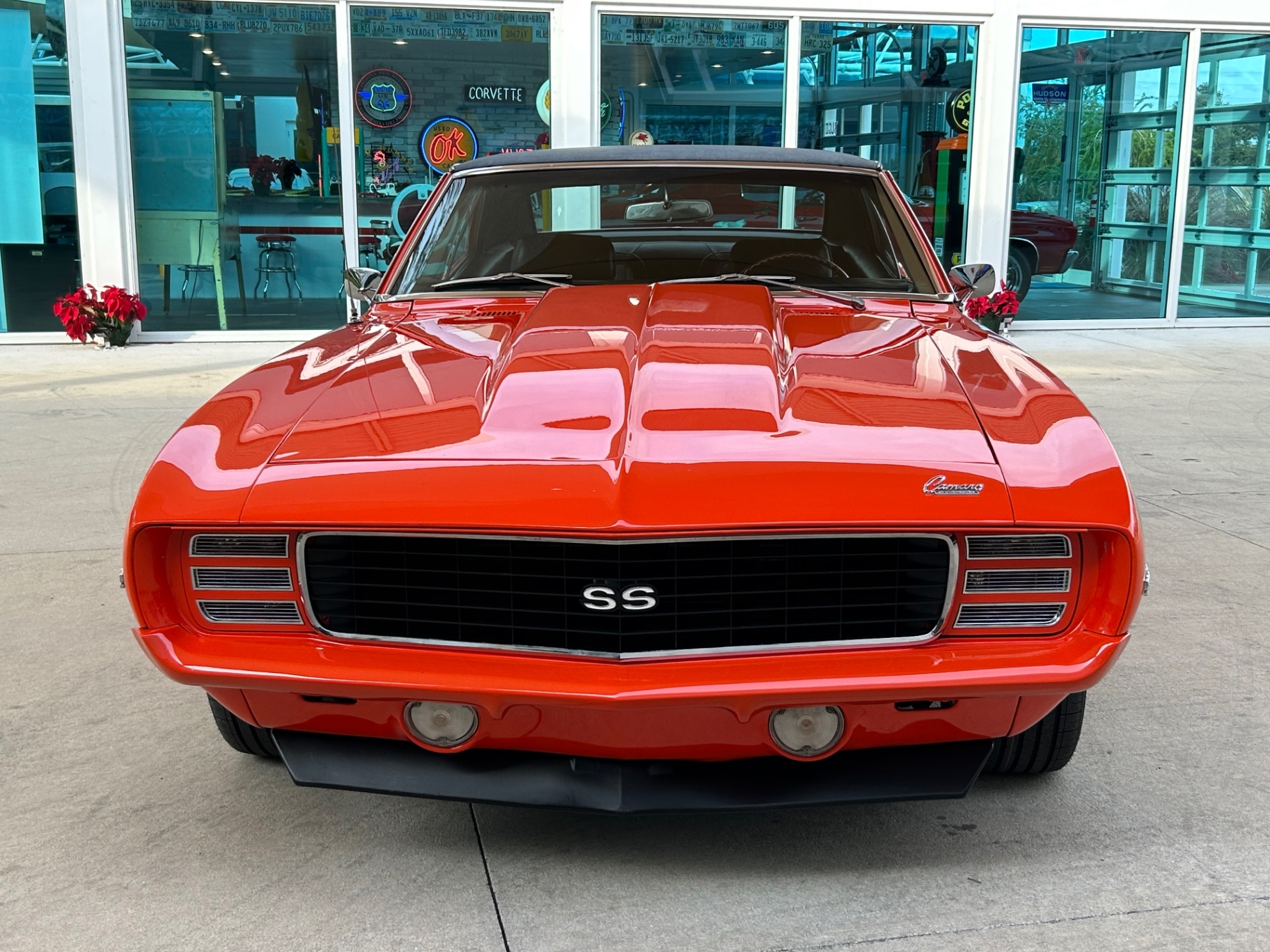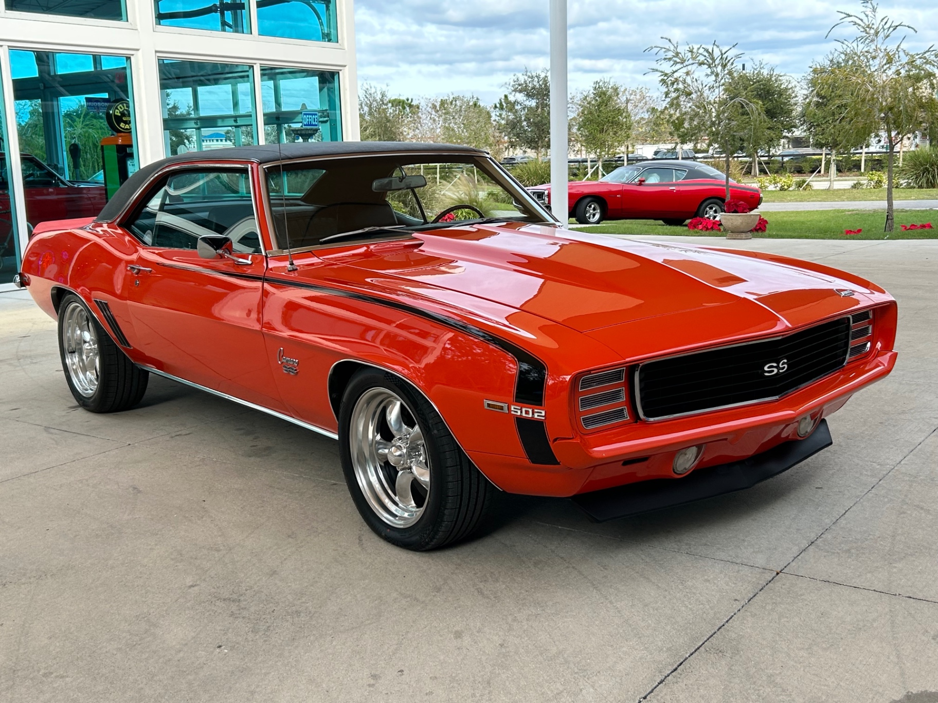 This 1969 Camaro SS RS stands out with its Hugger Orange paint and impressive performance features. It’s powered by a GM 502 engine, delivering 502 horsepower, and equipped with Holley fuel injection and a Tremec TKO 5-speed transmission. The vehicle includes power steering, 4-wheel disc brakes, and air conditioning for a comfortable driving experience. The exterior features a black vinyl top, front and rear spoilers, and American Racing Torque Thrust wheels. The iconic RS recessed headlight treatment adds to its distinctive look.