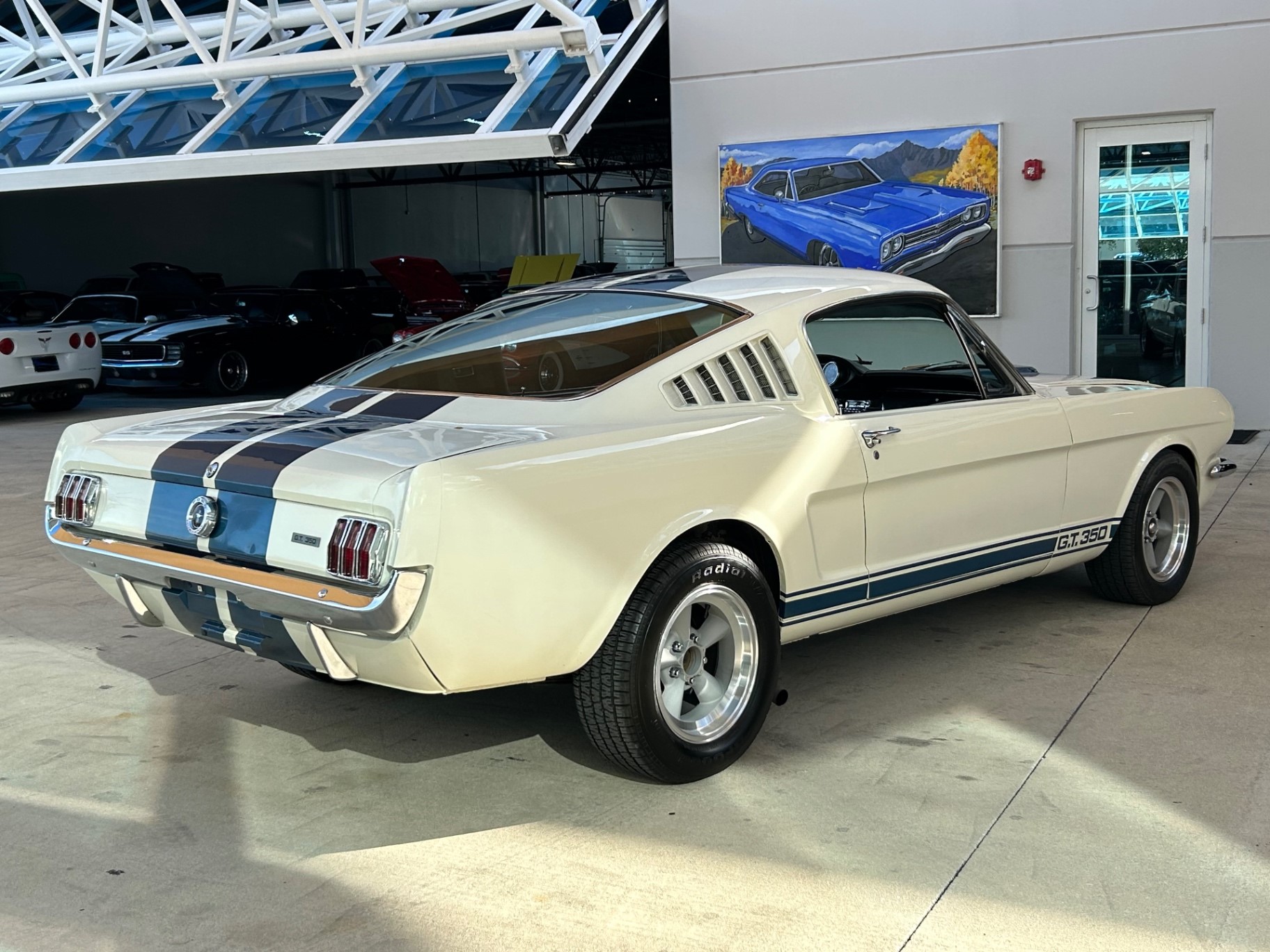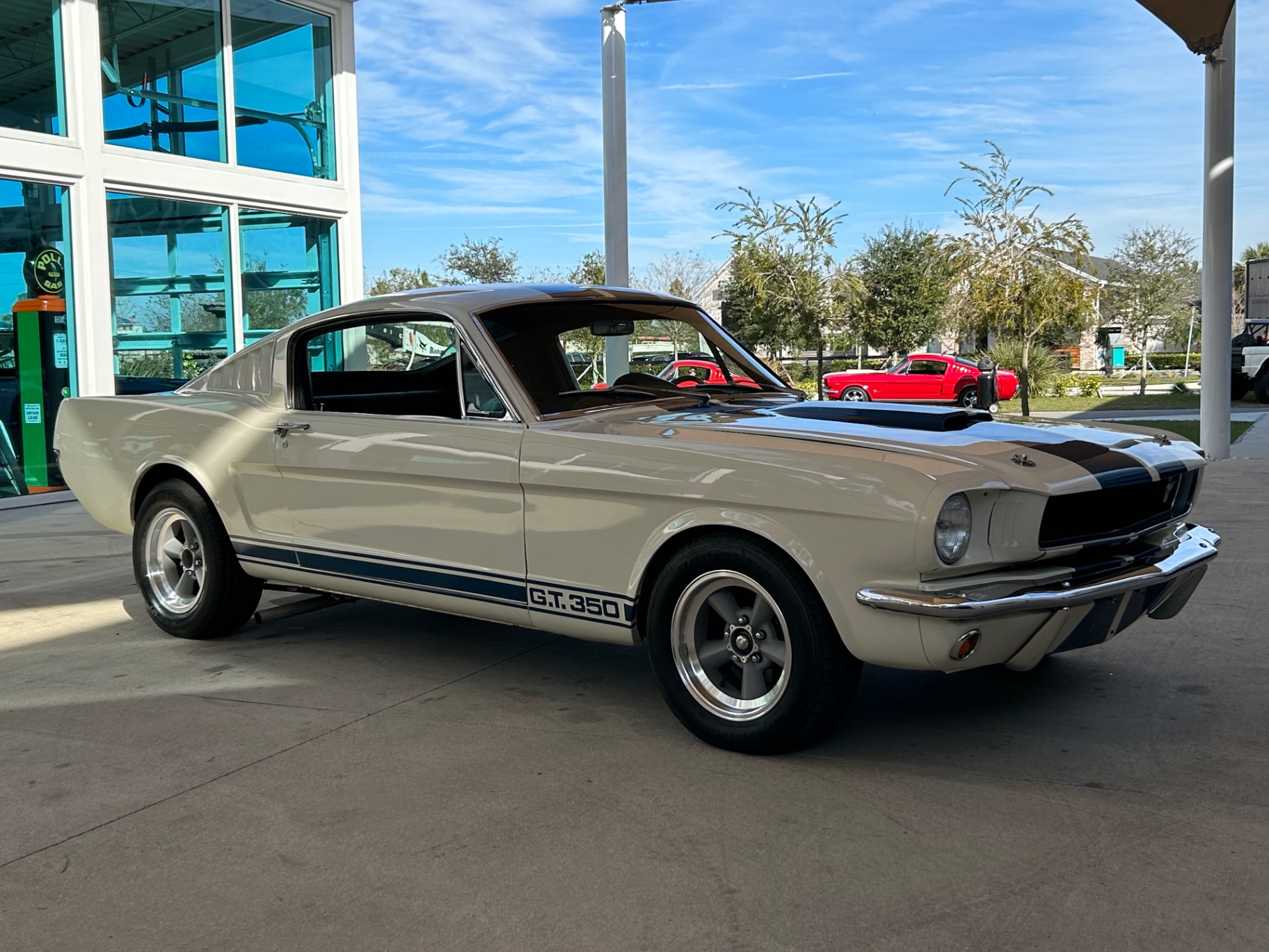 The interior boasts black twin bucket seats, matching rear seat, and factory dash with gauges and a tachometer in a pod. It also includes a wood steering wheel, chrome floor shifter, and GT 350 floor mats. The exterior is further highlighted by 5-spoke alloy wheels and black sidewall performance tires.