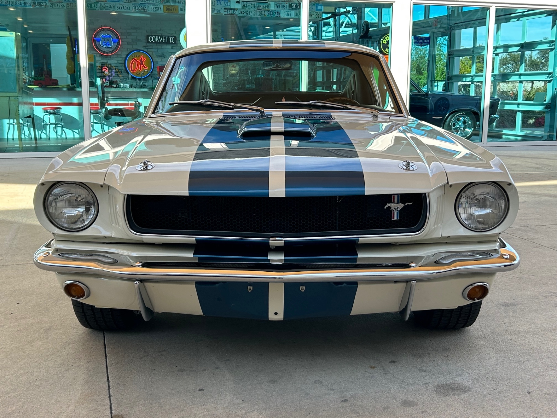 This 1965 Mustang Fastback Shelby GT 350 Tribute offers the classic Shelby styling with a budget-friendly twist. It features a striking white paint job with blue racing stripes, Shelby GT 350 side stripes, and hood scoop. Under the hood, it houses a 289 cubic inch V8 engine equipped with a four-barrel carburetor, performance intake, and headers with a dual exhaust system. The engine is paired with a 5-speed manual transmission and is complemented by a clean and detailed engine compartment.