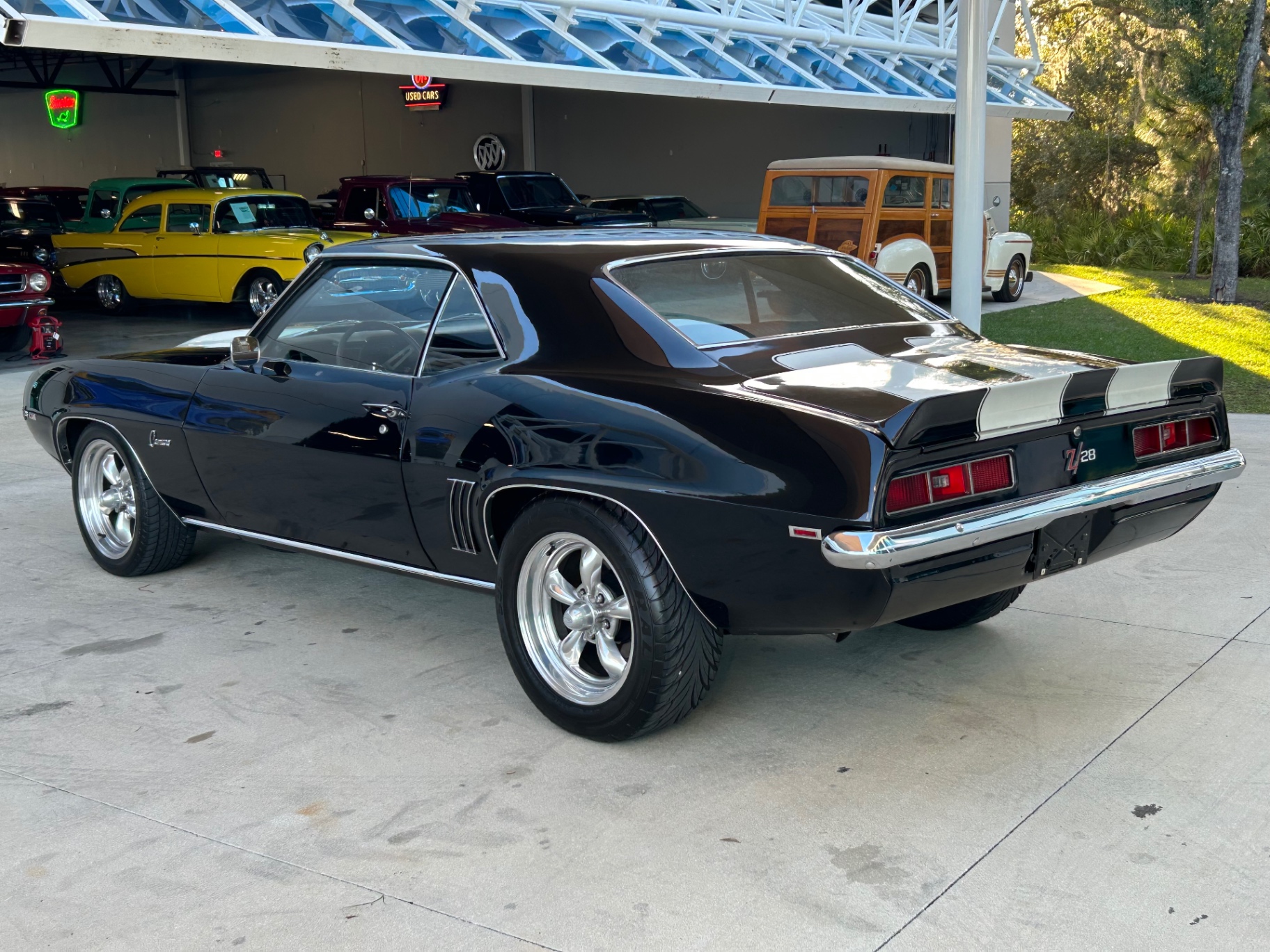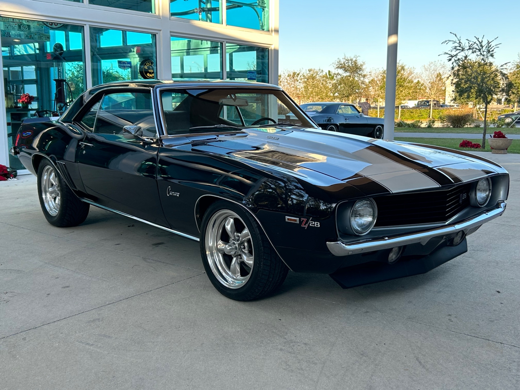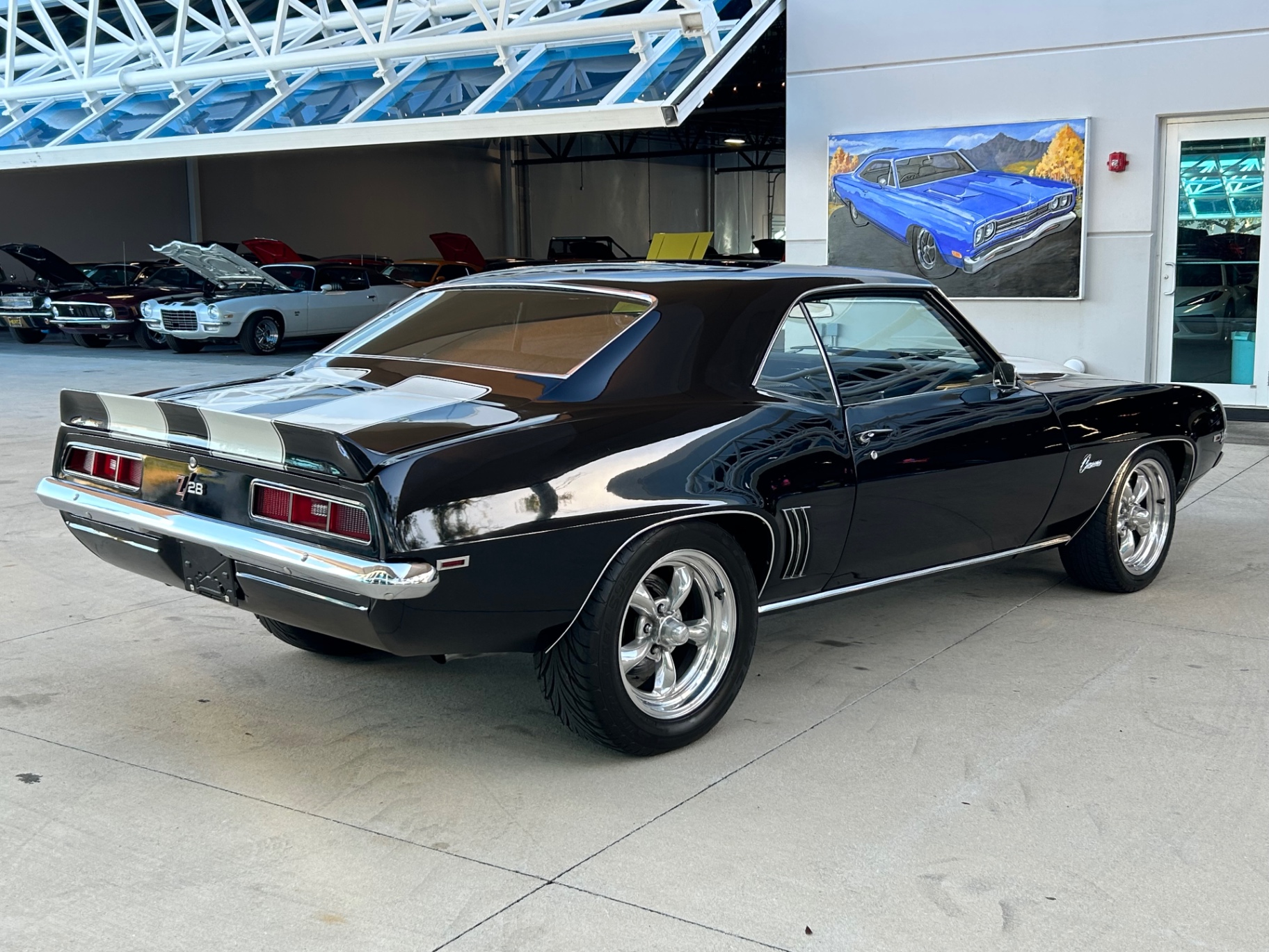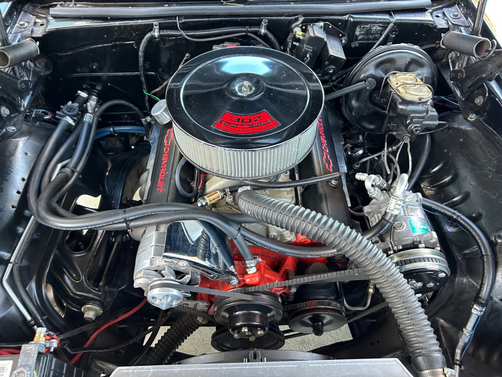 The 1969 Camaro Z28 Black Tribute stands out with its sleek black paint and contrasting white Z28 stripes, making a bold statement on the road. Beneath the hood lies a 350 cubic inch engine, paired with a 4-speed automatic transmission that delivers a smooth driving experience. The engine bay showcases performance enhancements, including an aluminum manifold and black tube headers, complemented by a chrome open air cleaner with a distinctive red decal.