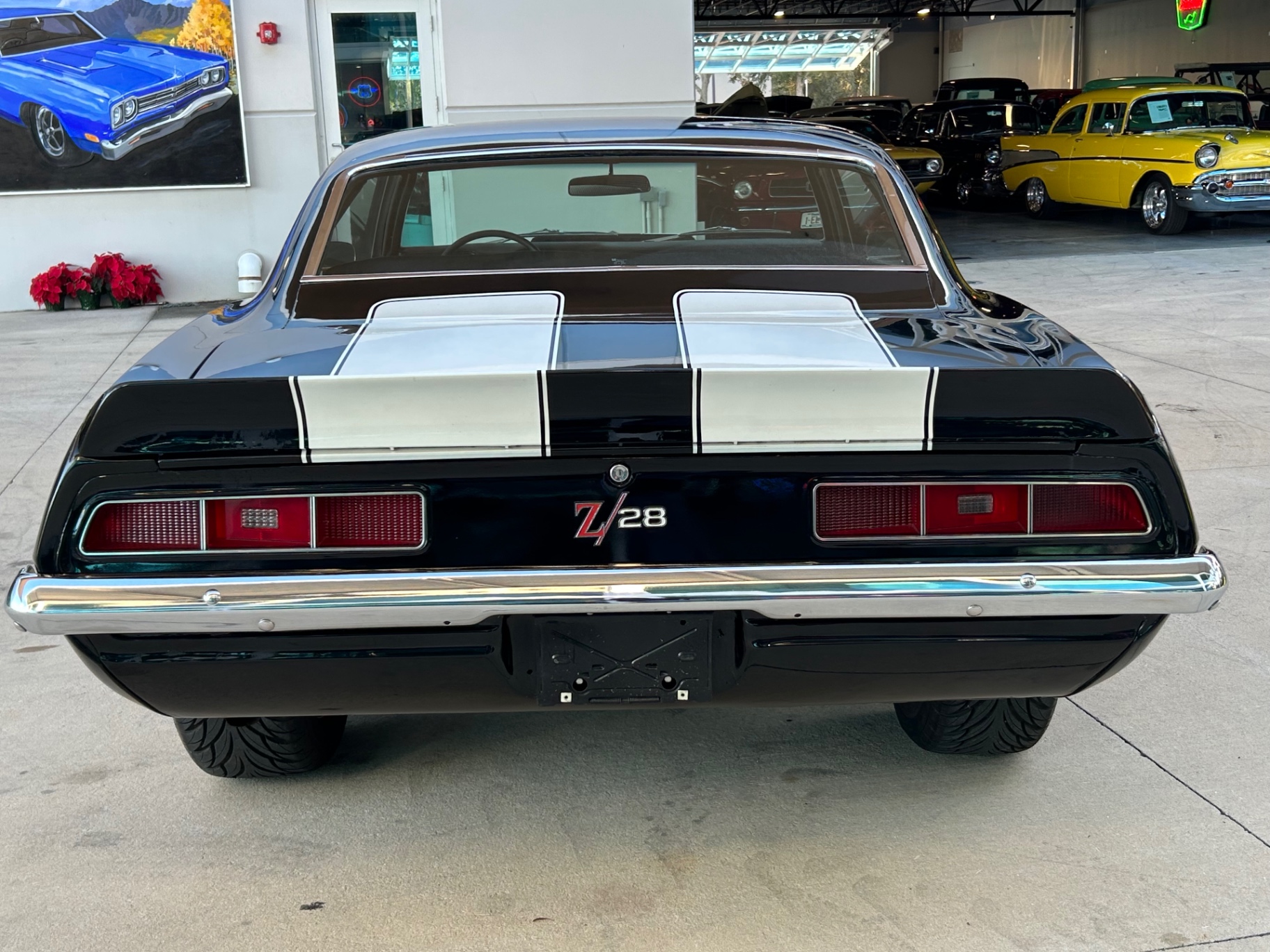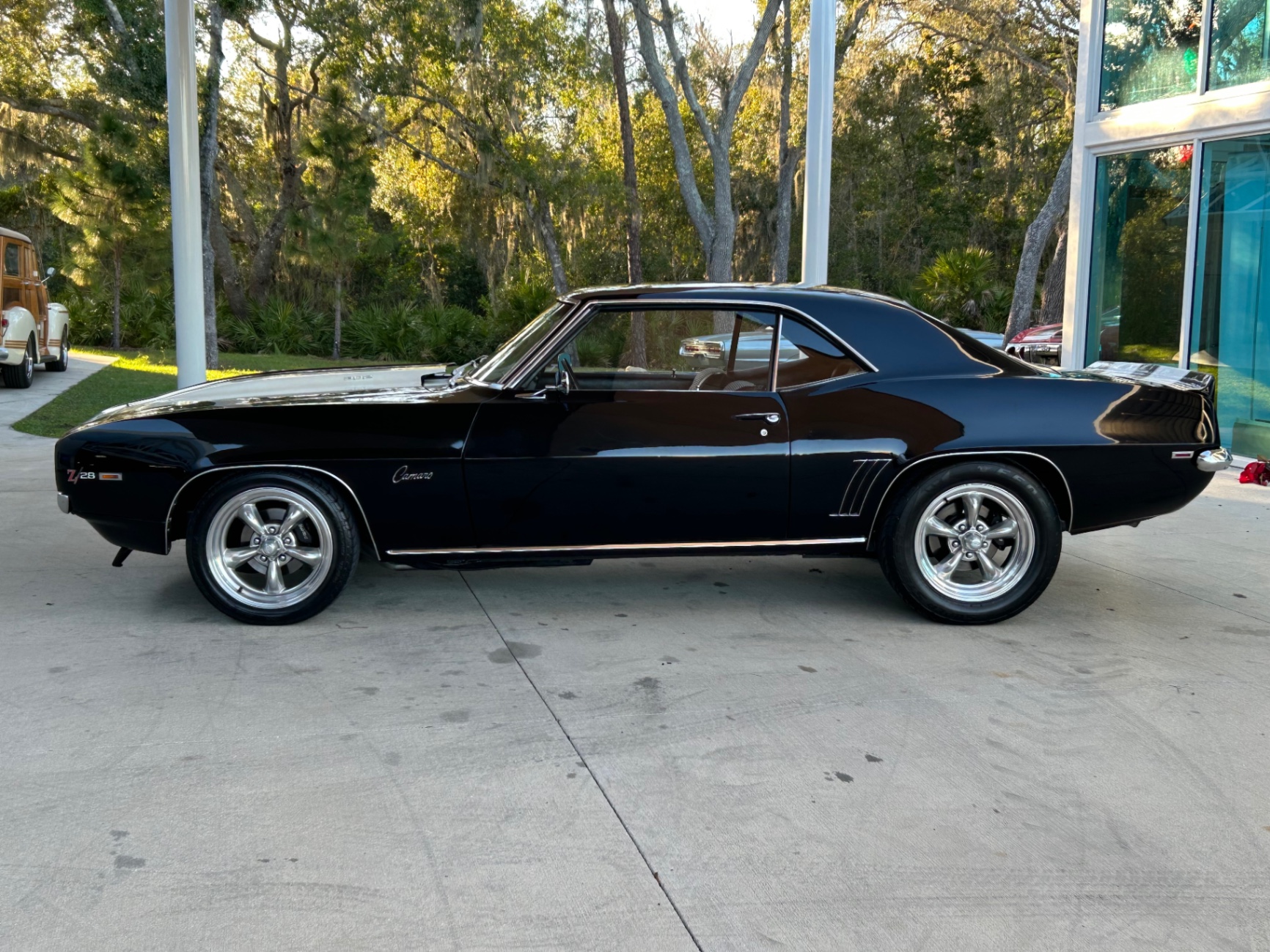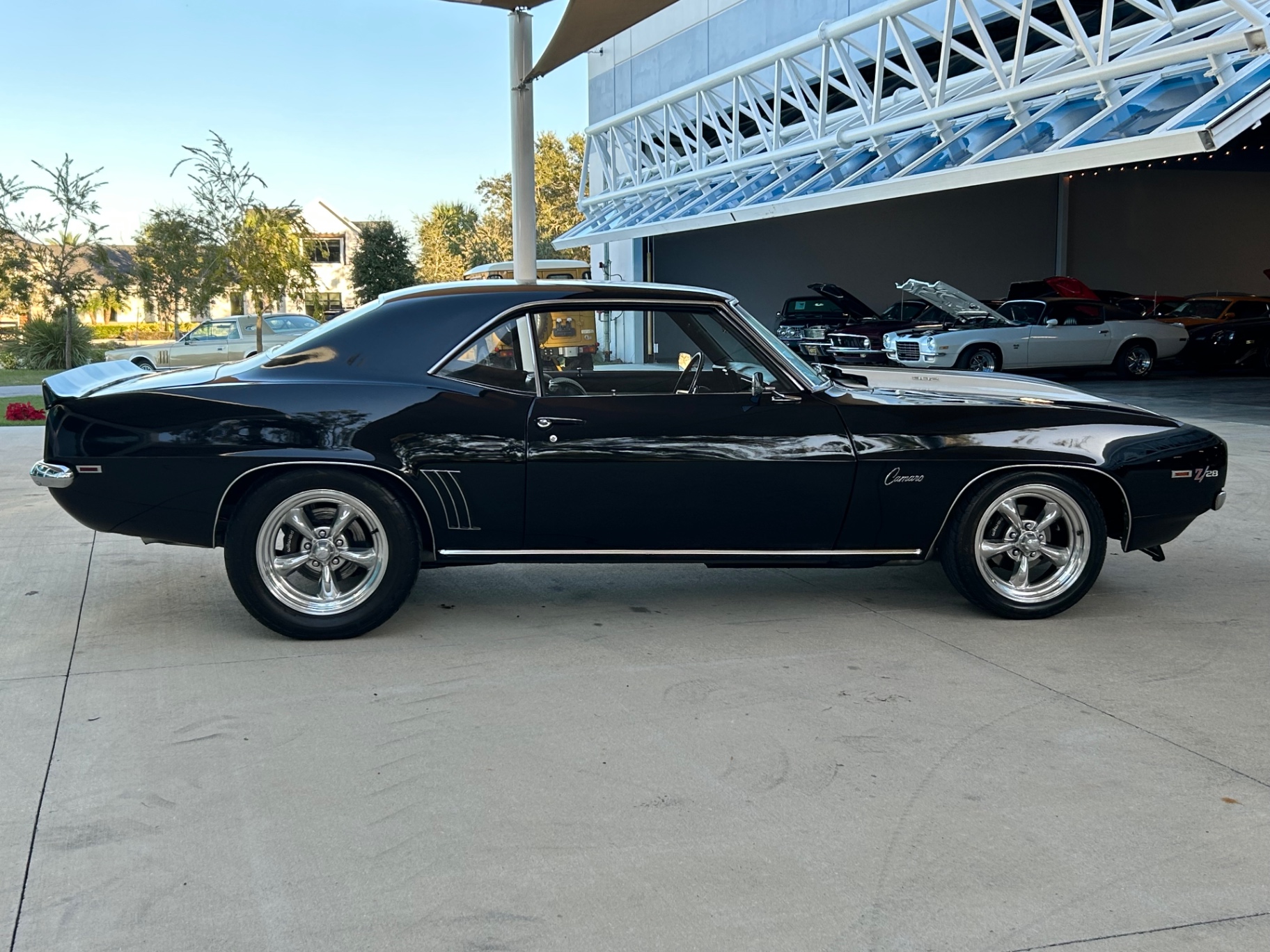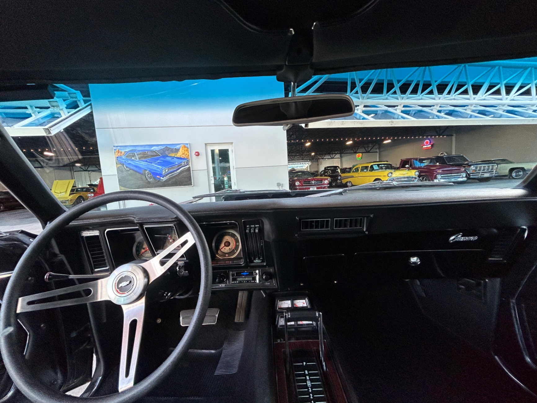 The 1969 Camaro Z28 Black Tribute stands out with its sleek black paint and contrasting white Z28 stripes, making a bold statement on the road. Beneath the hood lies a 350 cubic inch engine, paired with a 4-speed automatic transmission that delivers a smooth driving experience. The engine bay showcases performance enhancements, including an aluminum manifold and black tube headers, complemented by a chrome open air cleaner with a distinctive red decal.