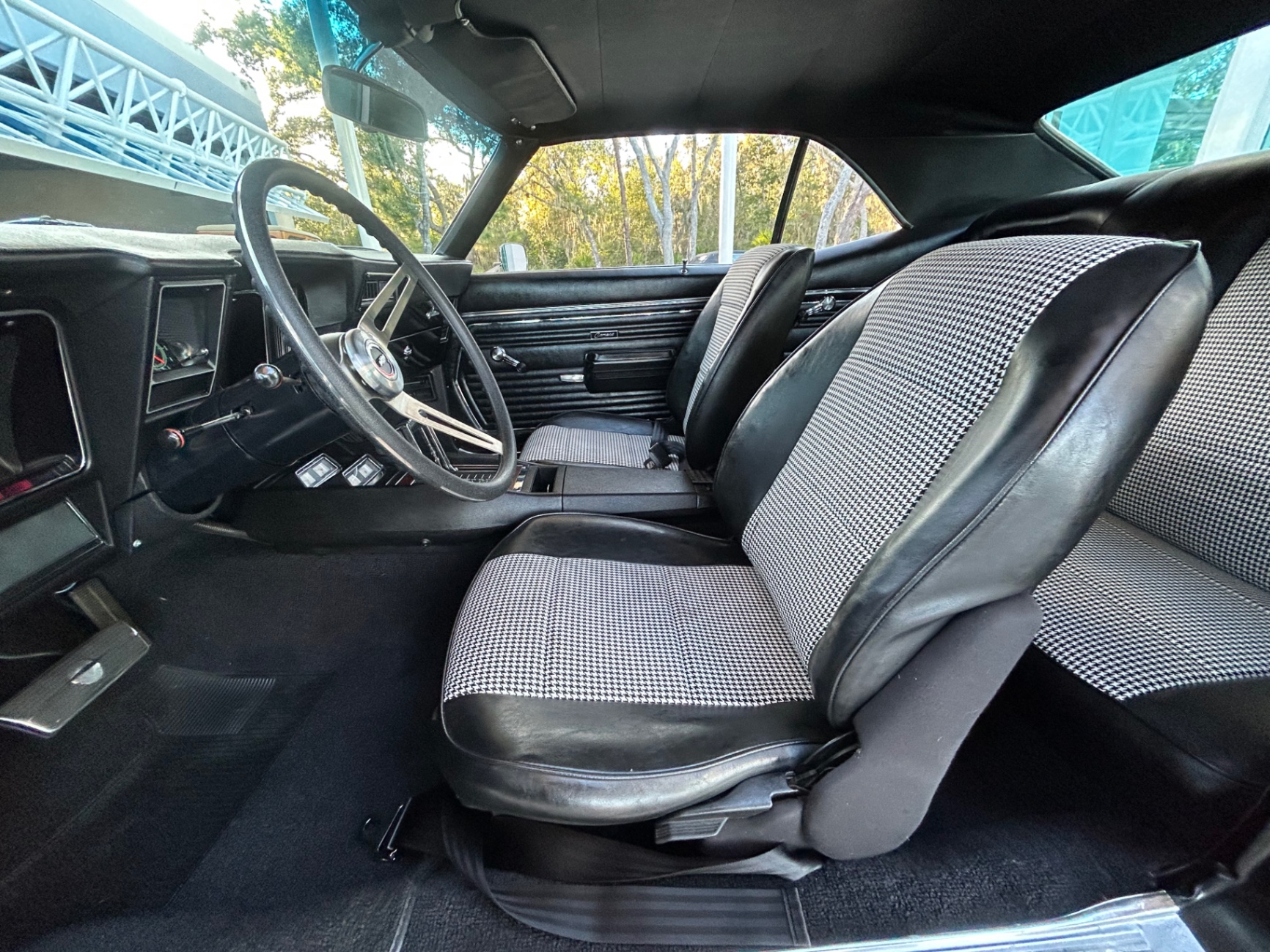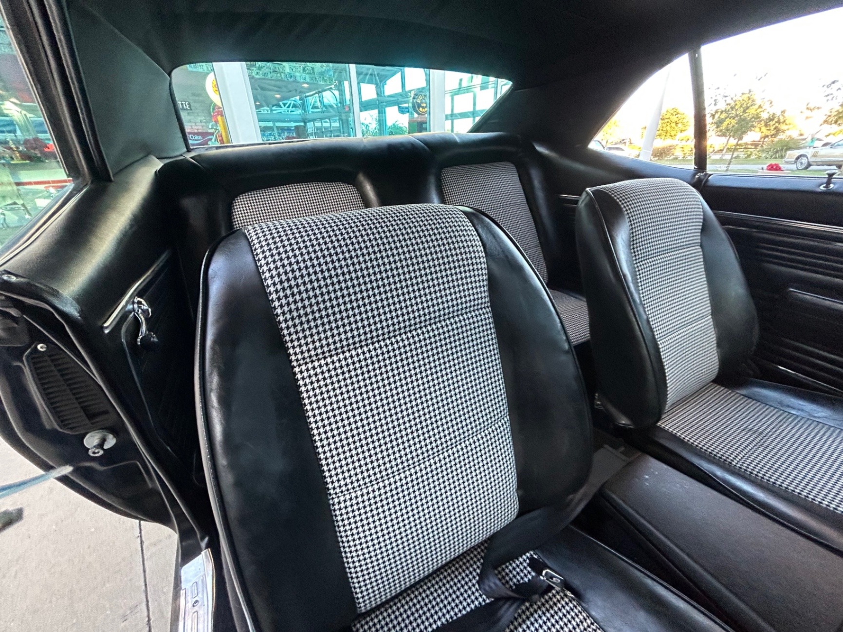 Inside, the interior features striking black and white Houndstooth upholstery on both the front bucket seats and the rear seat. The dashboard and center console are well-maintained, housing factory gauges alongside a chrome 4-speed automatic shifter. The black carpet and sport steering wheel add to the car’s classic appeal.