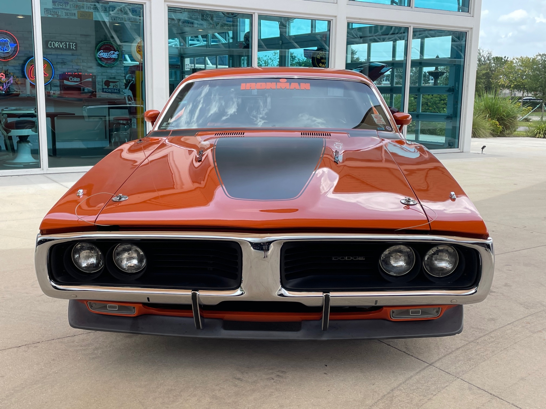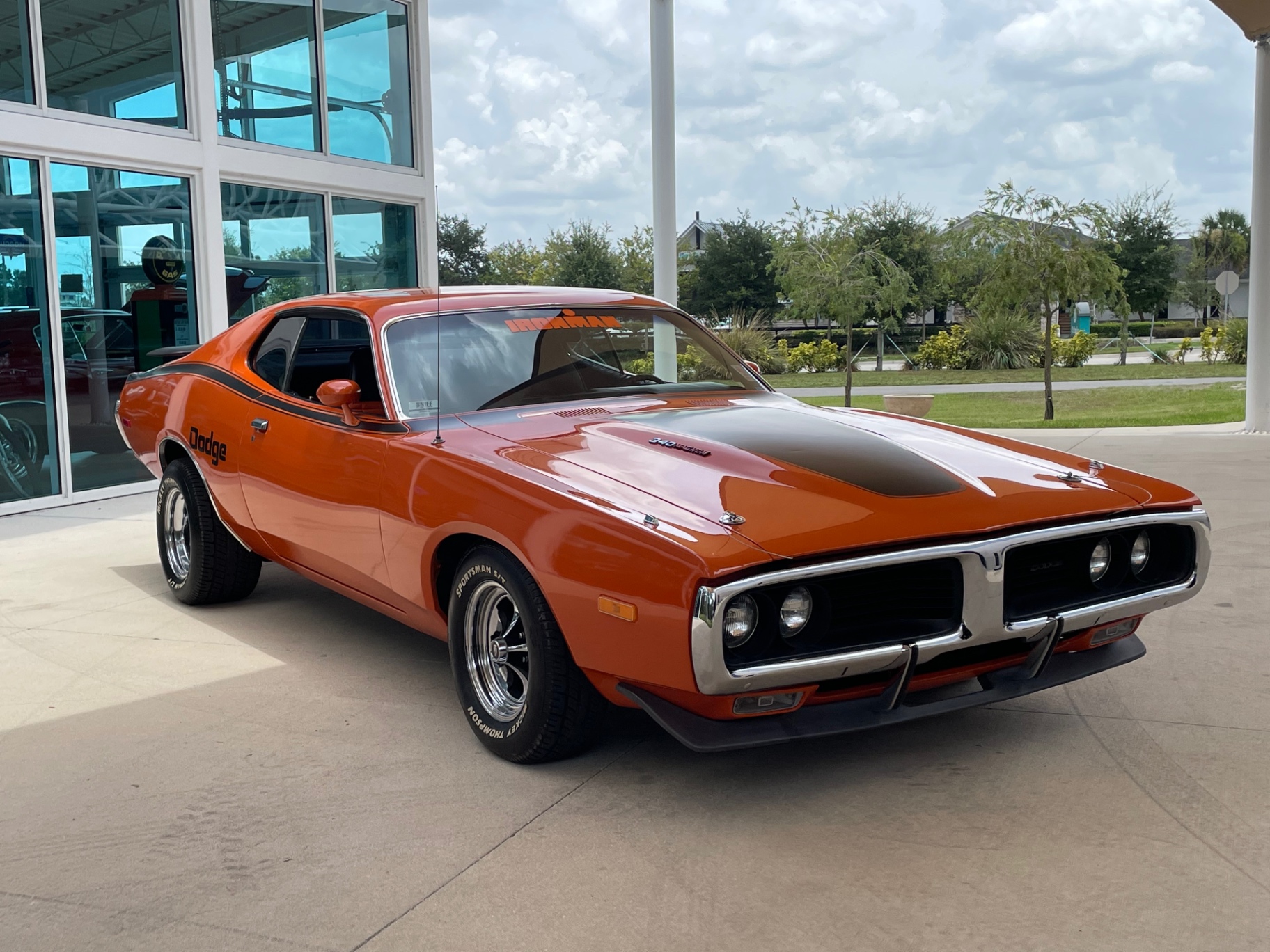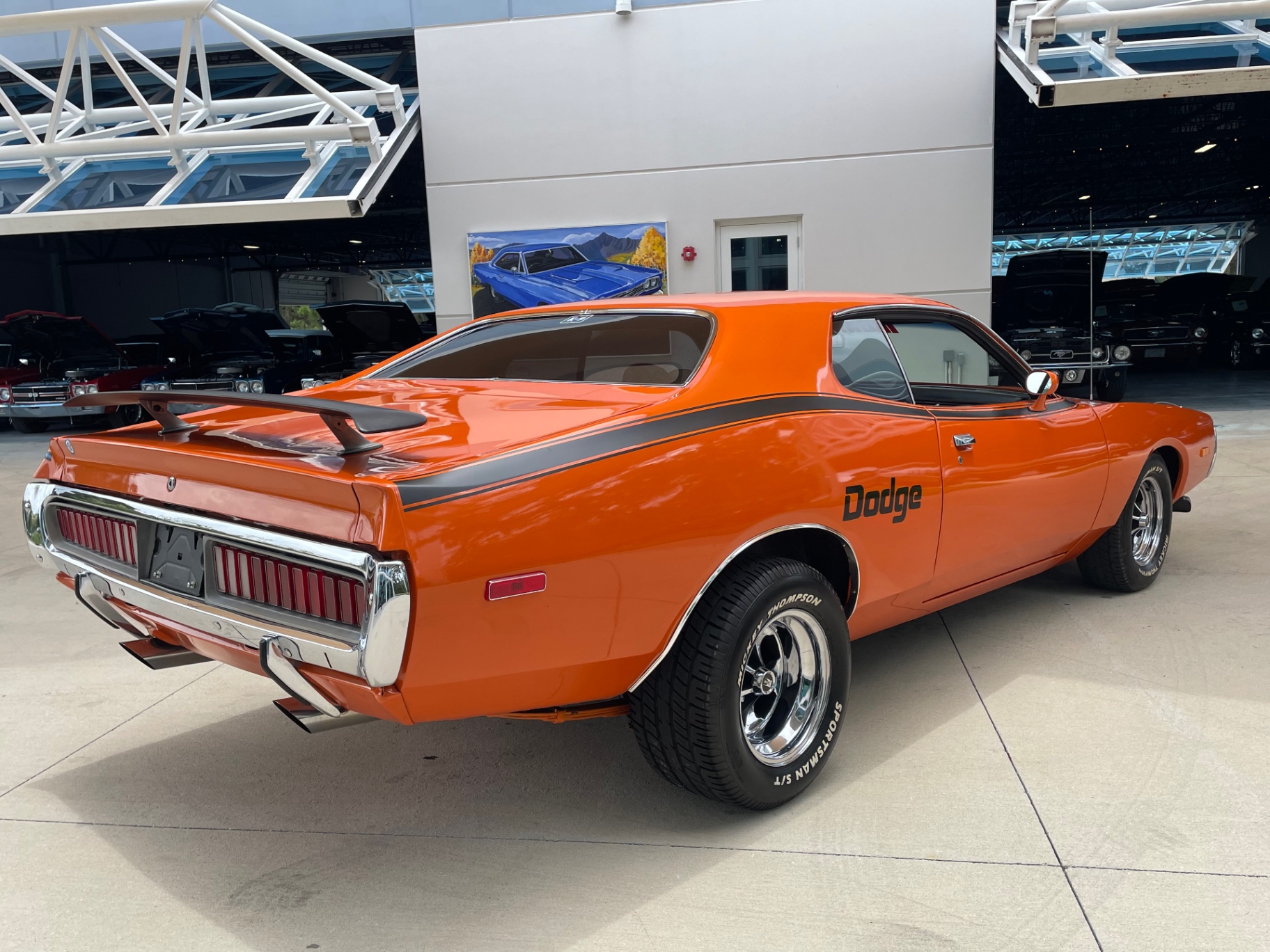 The 1973 Dodge Charger is a quintessential example of '70s American muscle, embodying the era's distinctive styling and performance. It boasts a 340 cubic inch Magnum V8 engine, renowned for its power and torque, enhanced by an orange and chrome open-element air cleaner, headers, and a dual exhaust system. The engine is paired with a 727 TorqueFlite 3-speed automatic transmission and a heavy-duty rear end, ensuring robust performance.