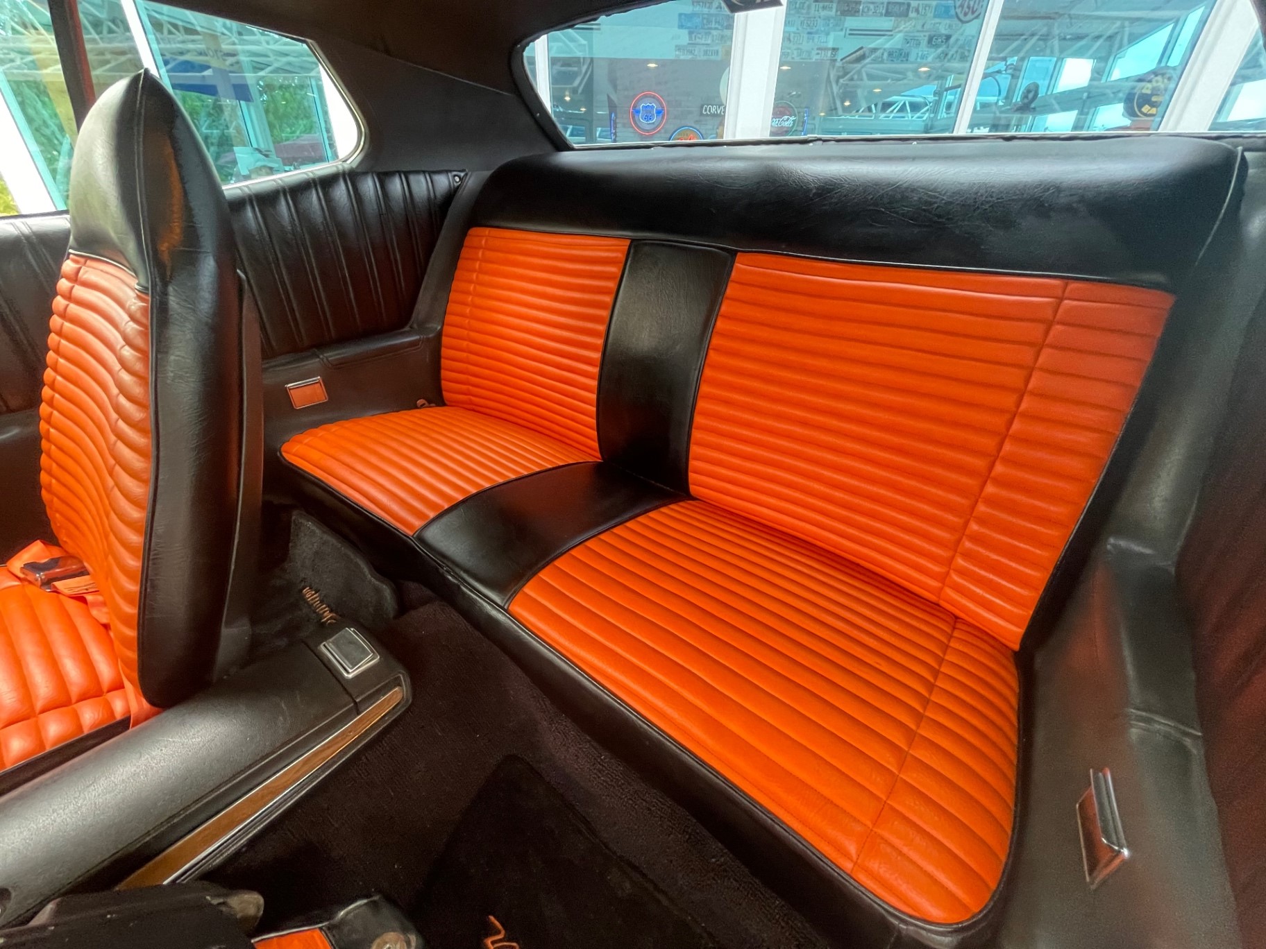 The Charger’s exterior features a striking orange paint with black racing stripes, a power-bulge hood with 340 Magnum emblems, and a black rear wing. It sits on period-correct Keystone mag wheels wrapped in Mickey Thompson Sportsman GT raised white letter tires, which add to its aggressive stance.