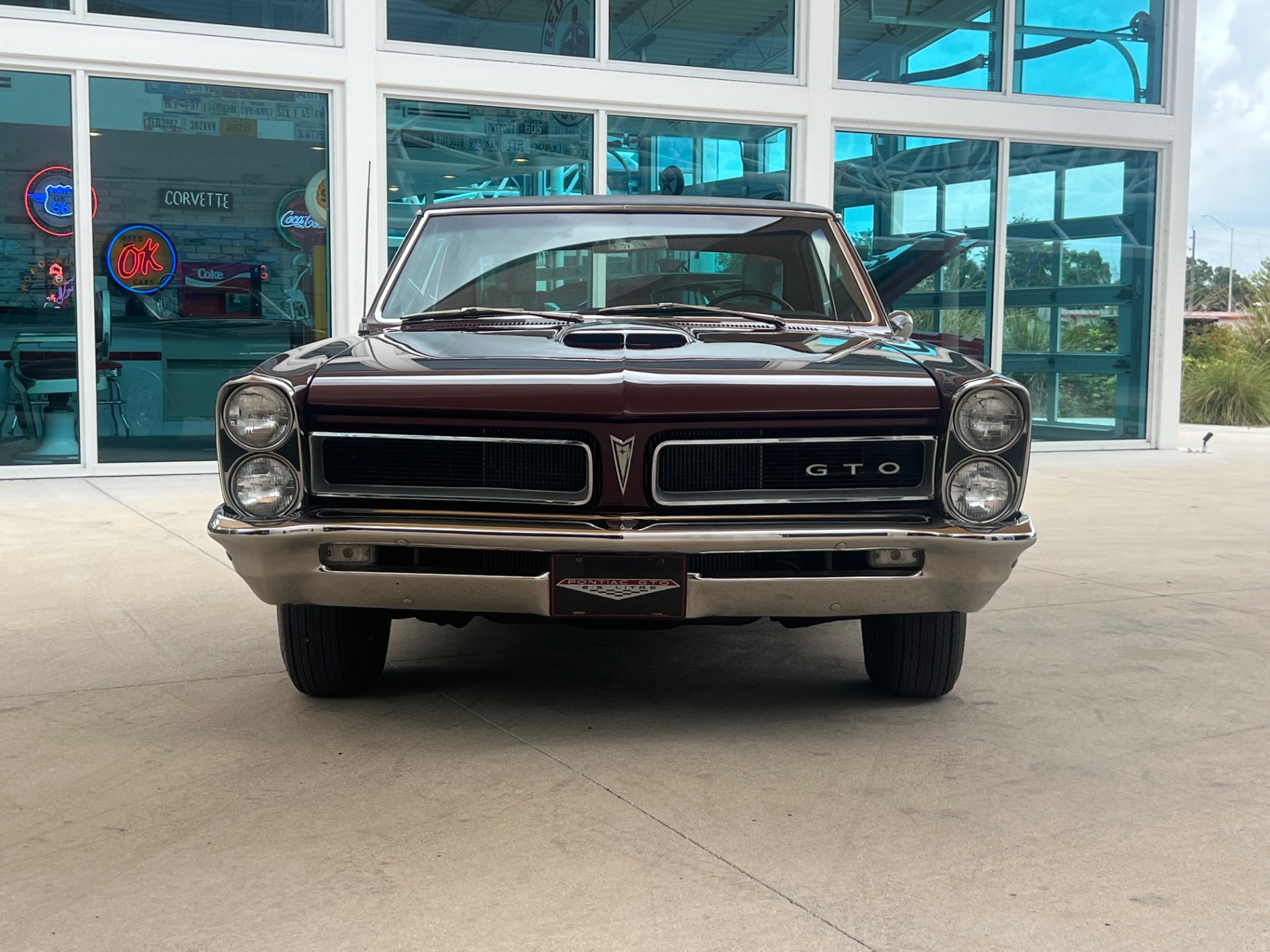 This 1965 Pontiac GTO represents a prime example of classic muscle car excellence. Under the hood lies a numbers-matching WT 389 cubic inch V8 engine, enhanced with a Tri-Power carburetor system and a 4-speed manual transmission. The engine, originally 389 cubic inches, has been upgraded to 462 cubic inches, delivering a robust 440 horsepower. The restoration includes a chrome open-element air cleaner, finned aluminum valve covers, and a dual exhaust system. The car’s exterior features a striking Burgundy paint, a black Cordova top, and chrome accents that highlight its aggressive stance. Inside, the factory-correct black vinyl interior has been meticulously restored, showcasing twin front bucket seats, a matching rear seat, and a dashboard with woodgrain trim and original gauges. The center console houses a chrome shifter with a white ball. Additional features include power steering, power brakes, and Pontiac-styled wheels with red-line radial tires. The GTO rides smoothly on Rally wheels and maintains nearly all original sheet metal, with a well-detailed engine compartment. This vehicle blends historical authenticity with modern performance enhancements, making it an exceptional choice for collectors and enthusiasts seeking a standout classic muscle car.