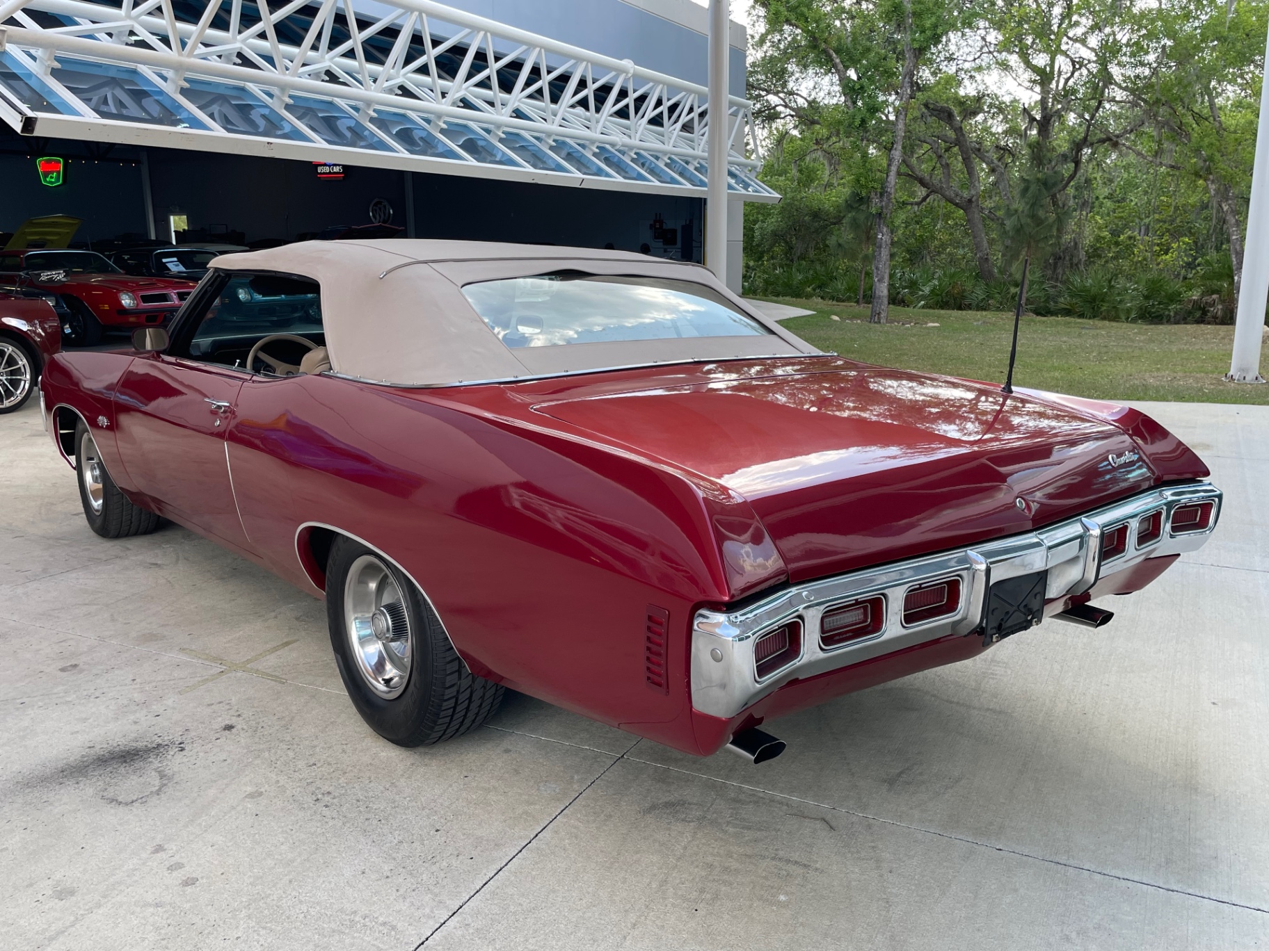 This 1969 Chevrolet Impala SS Convertible stands out with its 350 cubic inch engine and automatic transmission. The engine is finished in Chevrolet orange, complete with painted block, heads, valve covers, and intake. It features a four-barrel carburetor and a chrome Edelbrock open element air cleaner. The car is equipped with power steering and aftermarket air conditioning. The exhaust system includes cast iron factory manifolds and dual exhaust pipes.