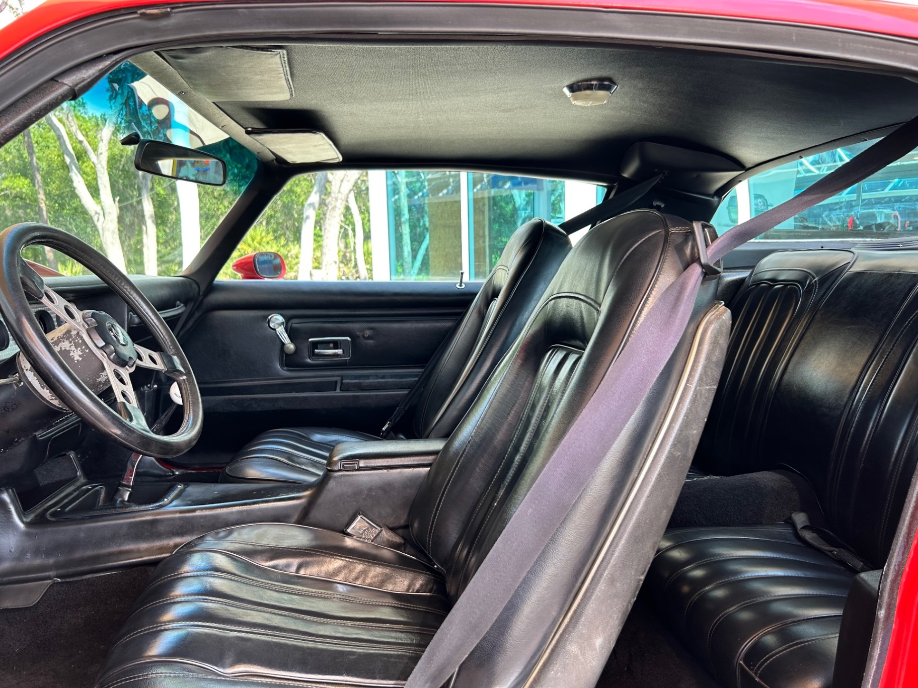 The interior of this Trans Am is finished in black vinyl, featuring high-backed front bucket seats, a matching rear seat, and a black center console with a chrome shifter. The black/polished three-spoke Pontiac TA formula steering wheel and machined aluminum dash with factory Rally gauges add to the car's classic appeal. It also includes a pushbutton radio system and black carpeting.